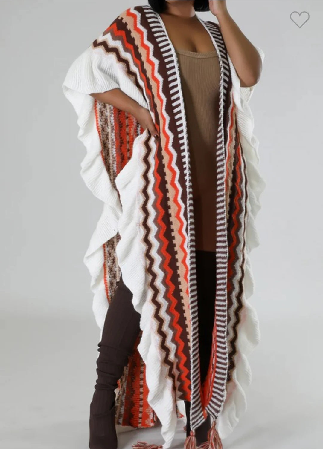 Wrap yourself in comfort and style with the Aleeisha Shawl Sweater Duster! This open, long sweater shawl features ruffle open sides and tassels on the bottom for added flair. Made with a beautiful soft knit fabric in gorgeous earth tone colors, this relaxed fit duster is perfect for layering and one size fits most. Stay cozy and chic all season long!