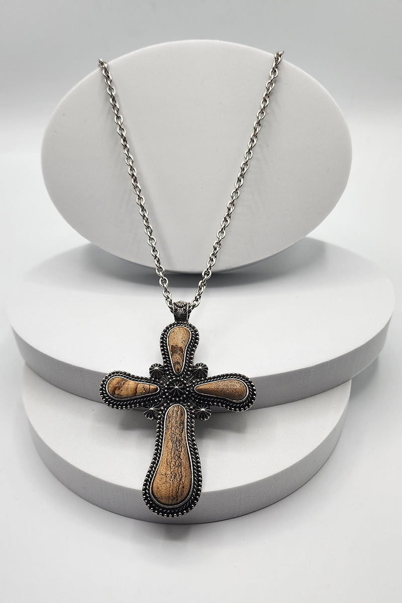 The Gracie Cross Necklace combines a sleek silver chain with a bold pendant choice—natural wood or turquoise. This striking piece adds an edgy touch to any outfit, perfect for those who dare to express their individuality with timeless symbolism and modern flair.