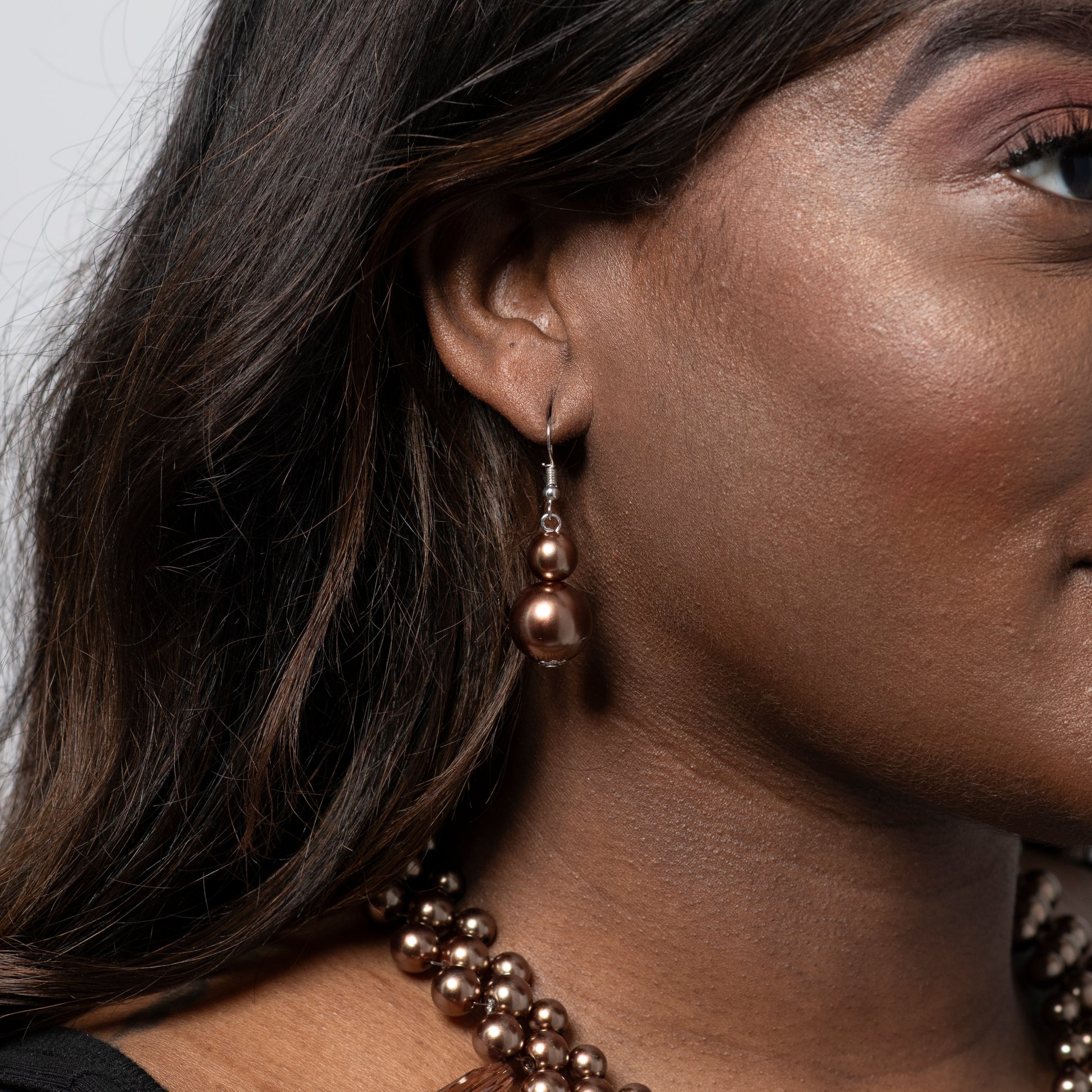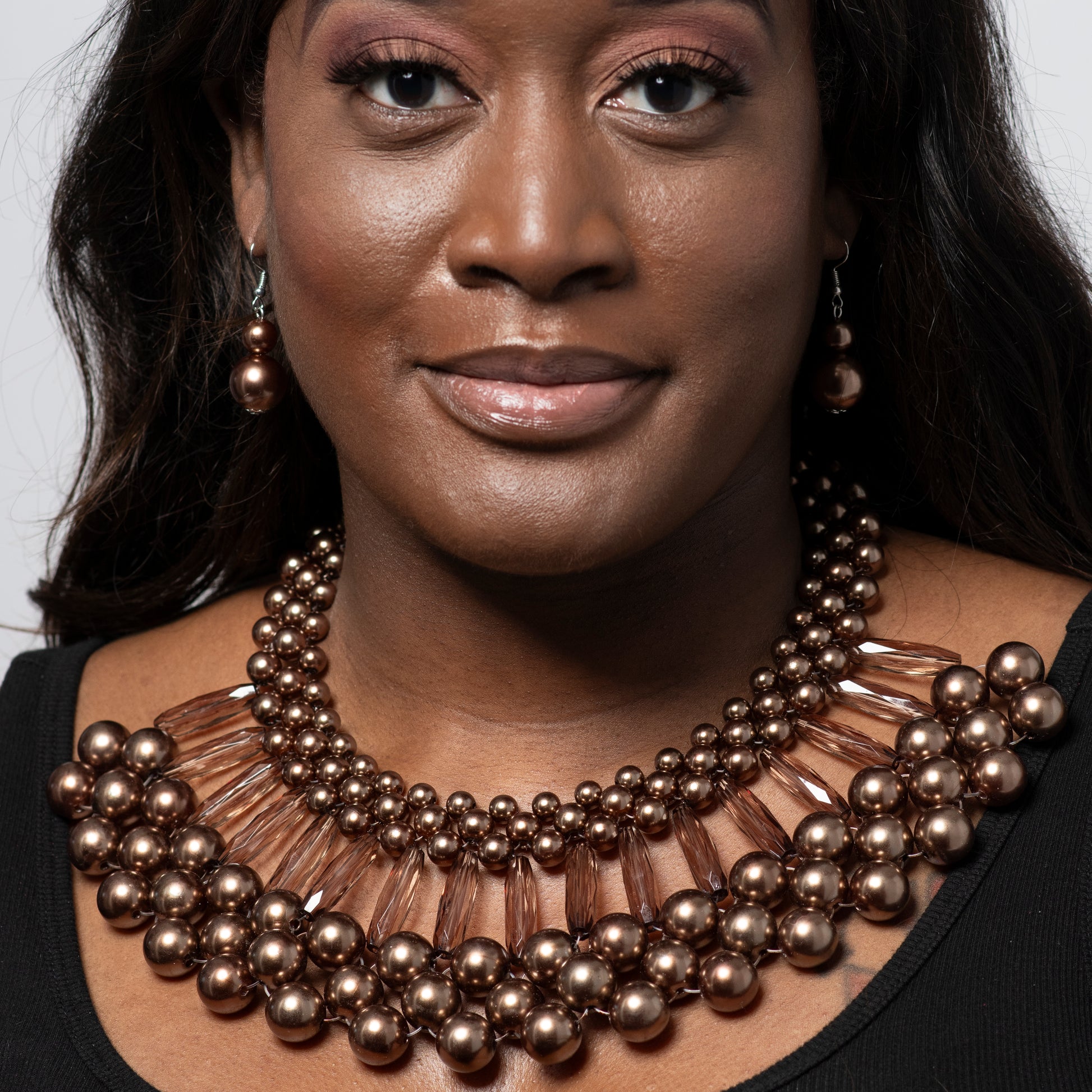 Unleash your inner fashionista with our Golden Bronze Beaded Statement Necklace Set. Handcrafted with intricate bronze beads, this statement bib necklace exudes elegance and sophistication. Perfect for adding a touch of luxury to any outfit, this set is a must-have for any fashion-forward individual. Elevate your style with this exclusive piece with matching earrings.Â