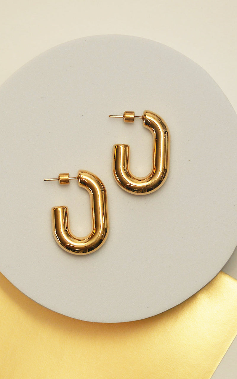 Introducing the Nara Hoop Earrings - small, yet bold. Made from 18K gold dipped stainless steel, these mini oval hoops are the perfect accessory for any occasion. A smaller version of our popular Take It EZ earrings, these will elevate your style game to new heights!