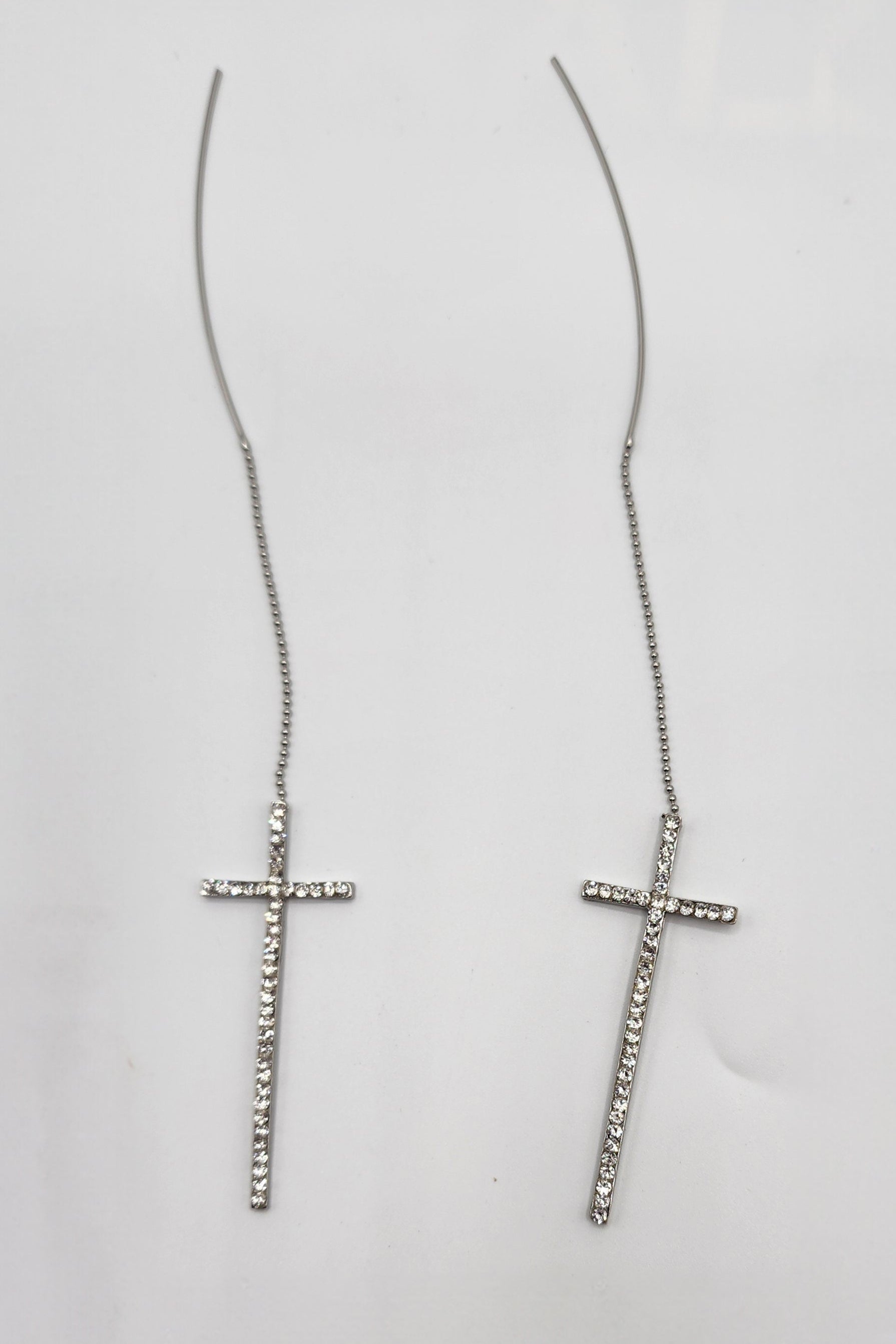 Elevate your style with our Silver Cross Drop Earrings. Crafted with sparkling rhinestones and a delicate silver finish, these earrings add a touch of luxury to any outfit. With their elegant design, they are perfect for any occasion, whether it be a night out or a formal event. Make a statement with these exclusive earrings.