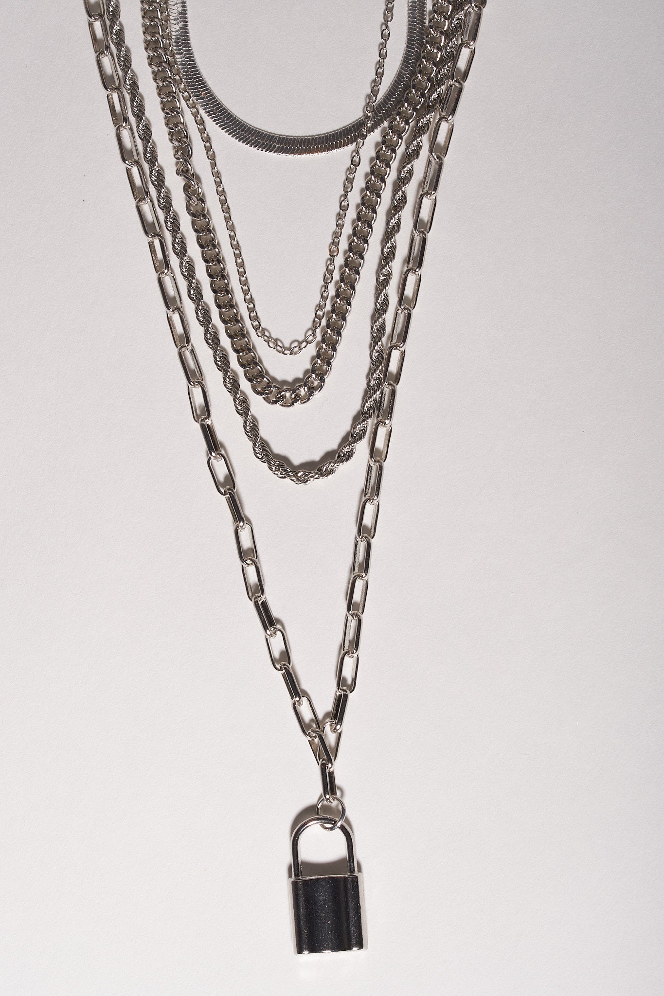 Unlock style and versatile look with our Padlock Layered Necklace! 5 layers of varying sizes and types create a unique and eye-catching style, while the padlock pendant adds a touch of edgy charm. Perfect for adding a touch of elegance to any outfit.