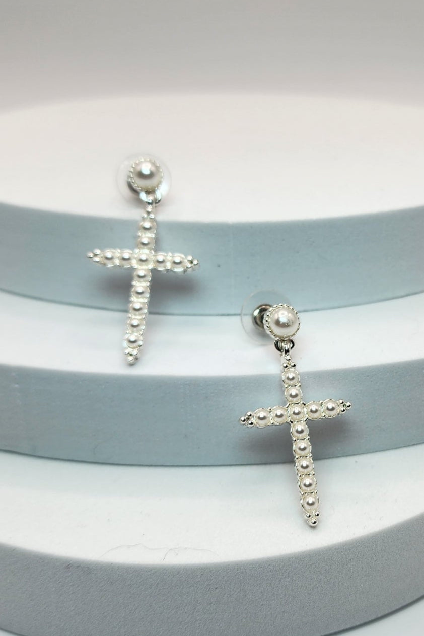 Elevate your style with these daring Pearly Cross Earrings. Crafted with delicate pearls arranged in a bold cross design, they blend subtle elegance with striking edge—perfect for those who make a confident statement with understated grace.