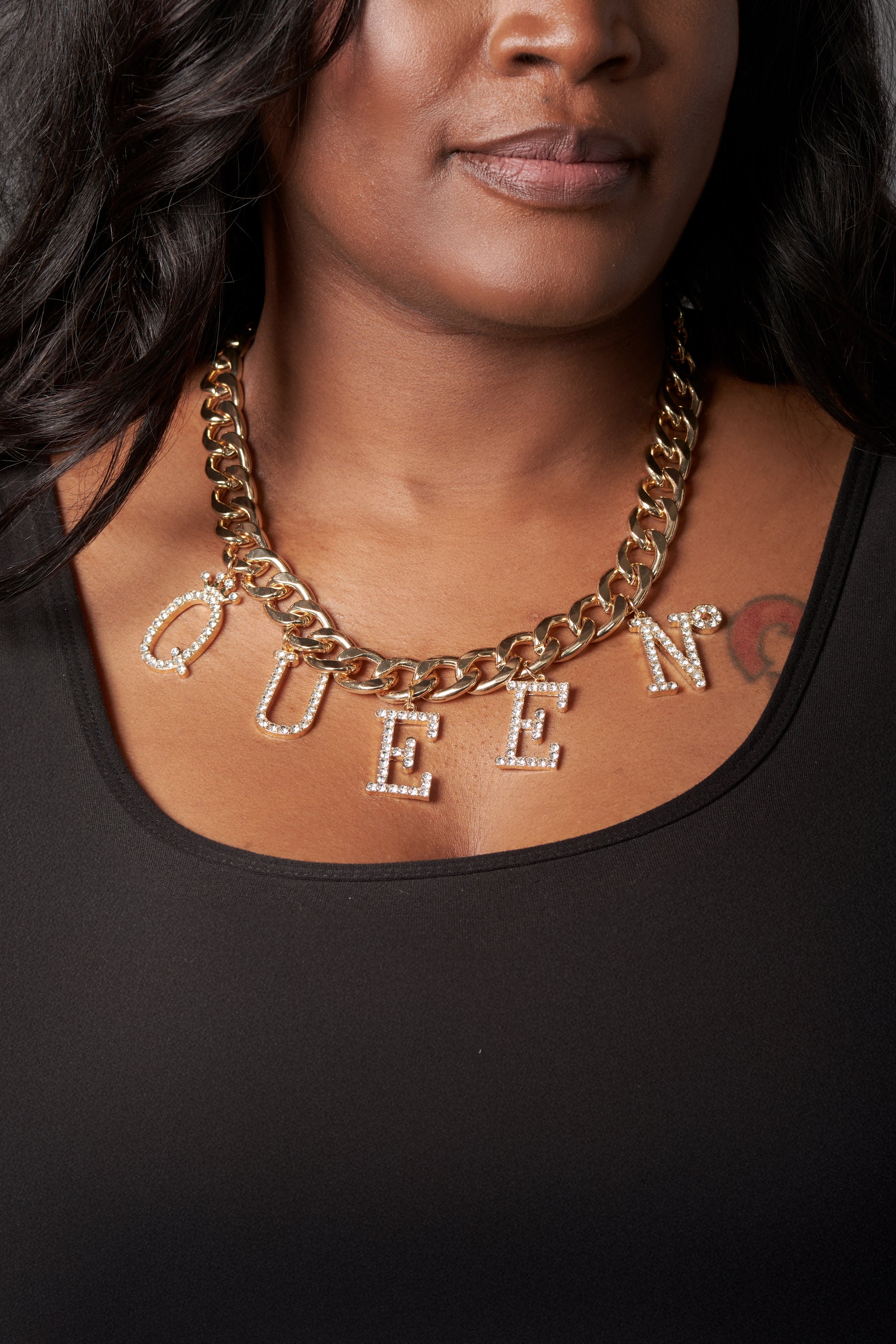 Make a bold statement with our Statement Queen Chain Link Necklace! Each diamond letter spells out the word "queen", exuding a strong and youthful vibe. Perfect for an urban look, this gold tone necklace will elevate any outfit and make you feel like royalty.